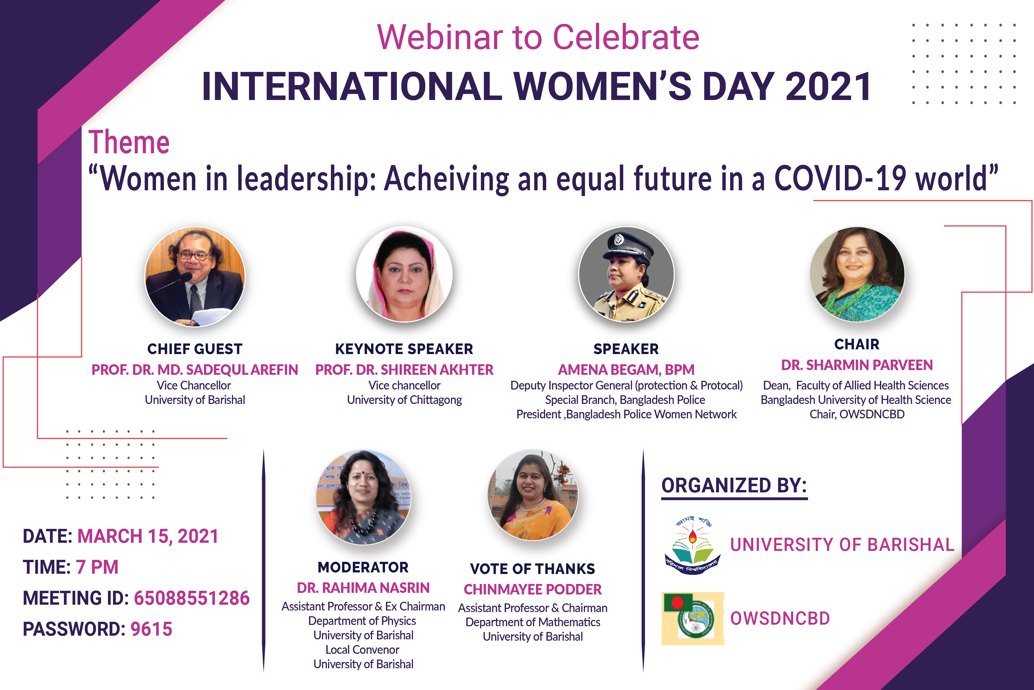 Webinar in celebration of International Women Day 2021 on the key theme of IWD 2021, "Women in Leadership: acheiving equal future in the COVID-19 world", jointly organized by OWSD-BDNC and Barishal University.
