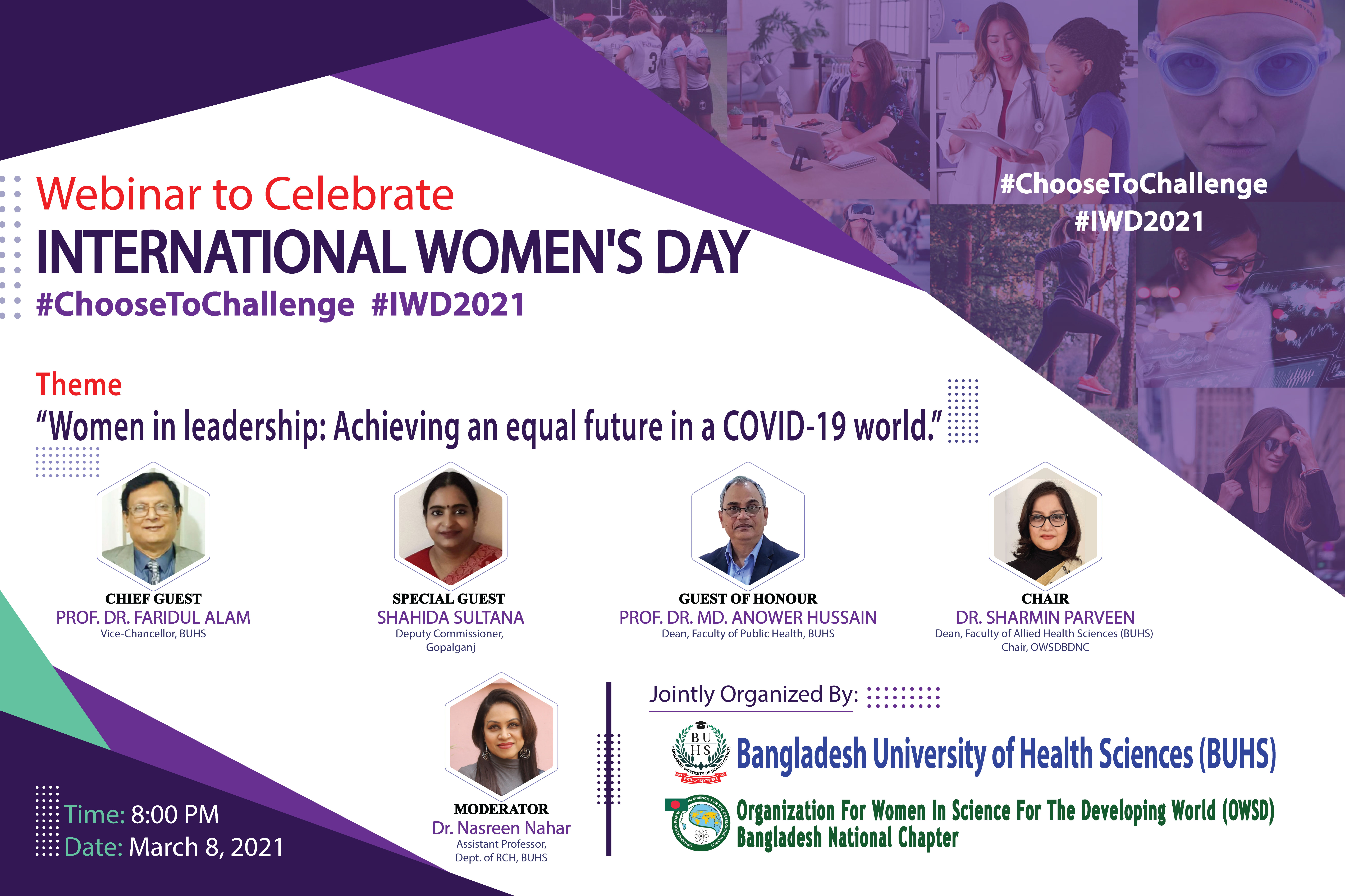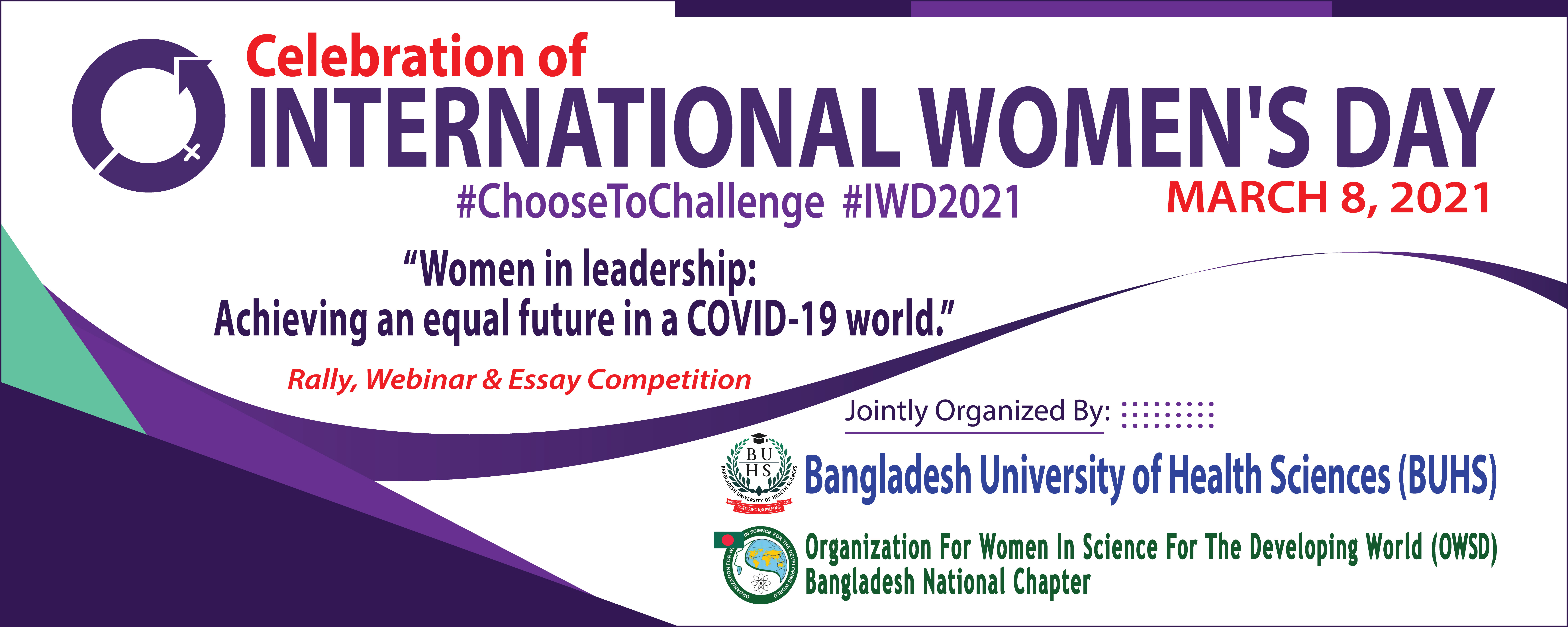 Celebration of International women’s day 2021, 8 March 2021 by organizing series of webinars and essay writing competition among girl students of various universities. One of the events is Co-organized by OWSD-BDNC & Bangladesh University of Health Sciences on the campaign theme of this year.