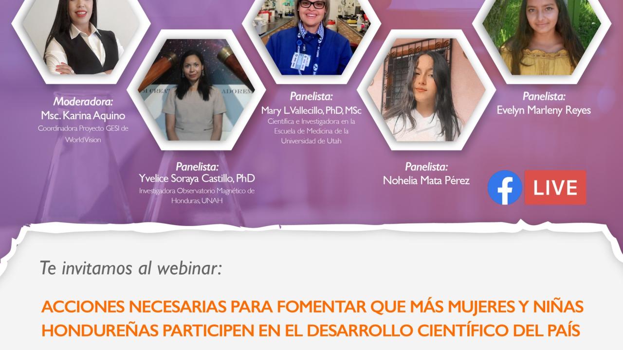 Te invitamos este viernes 11 de febrero a nuestro webinar Acciones necesarias para fomentar que más mujeres y niñas hondureñas participen en el Desarrollo Científico del país. Organizado por World Vision Honduras, OWSD Honduras y Honduras Global; para hablar sobre las mujeres y niñas en la ciencia, con mujeres y niñas hondureñas. Hora: de 4:00 pm a 5:00 pm hora de Honduras por FB live de https://www.facebook.com/worldvisionhonduras ¡Te esperamos¡
