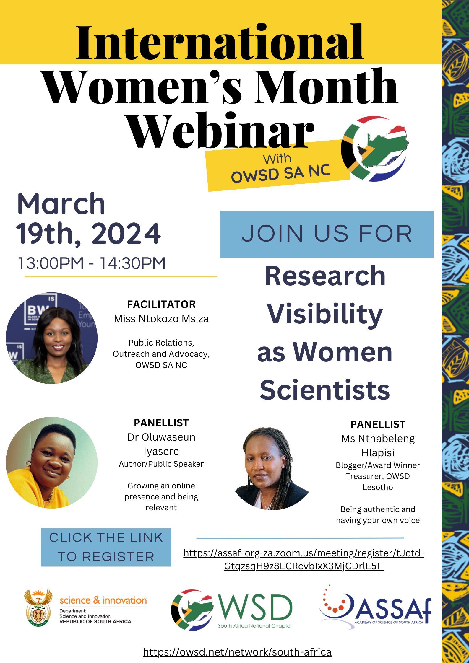 Join #OWSDSANC for an engaging virtual panel discussion on March 19, 2024, at 1pm in celebration of International Women’s Day. The "Research Visibility as Women Scientists" event aims to explore how women scientists can enhance their visibility and impact in the scientific community. The session will be interactive, allowing for stimulating questions and conversations with our fantastic speakers! See below for more details and click the link to register!