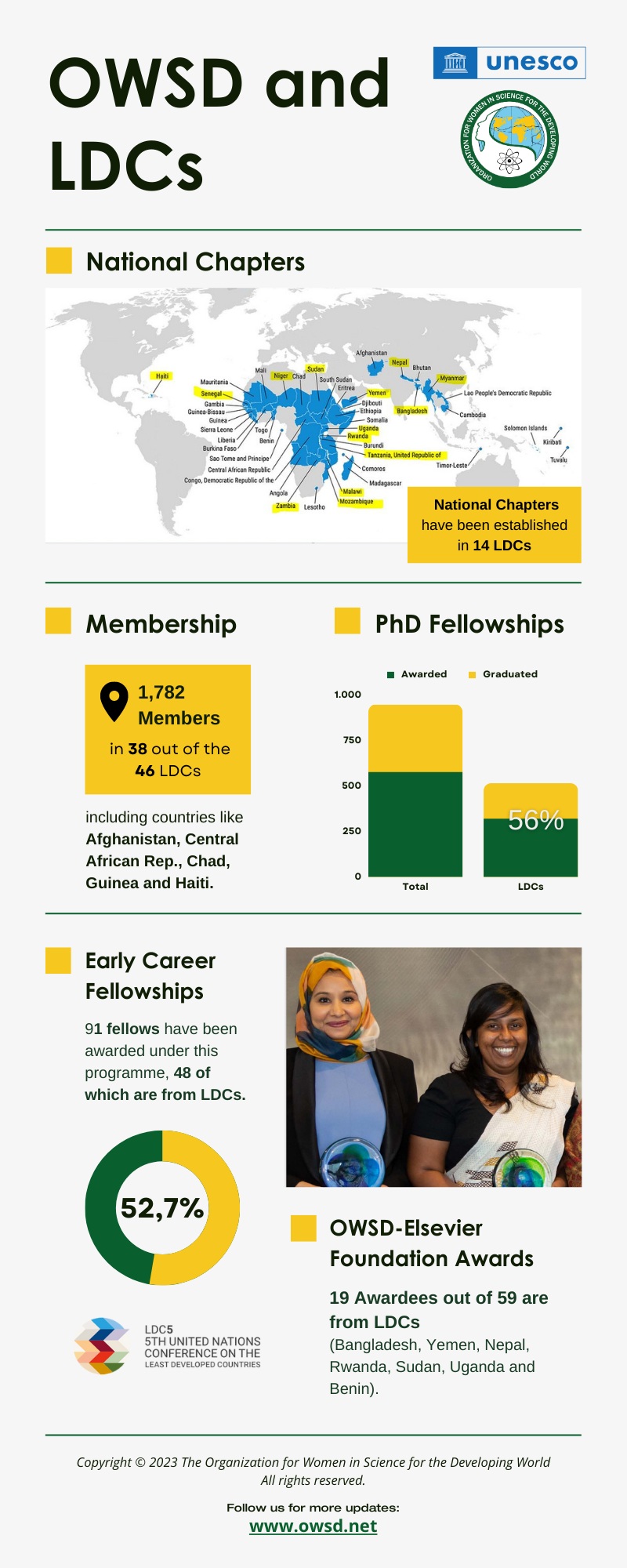 - OWSD-Elsevier Foundation Awards. The OWSD Secretariat has co-designed a high-profile awards scheme with The Elsevier Foundation, operative since 2013. The annual awards recognize and celebrate the achievements of 5 or more early career women scientists in the South who have worked hard against social, economic and cultural pressures to achieve internationally competitive results in research areas related to the United Nations Sustainable Development Goals (SDGs). As of today, 19 Awardees out of 59 are from LDCs (Bangladesh, Yemen, Nepal, Rwanda, Sudan, Uganda and Benin).