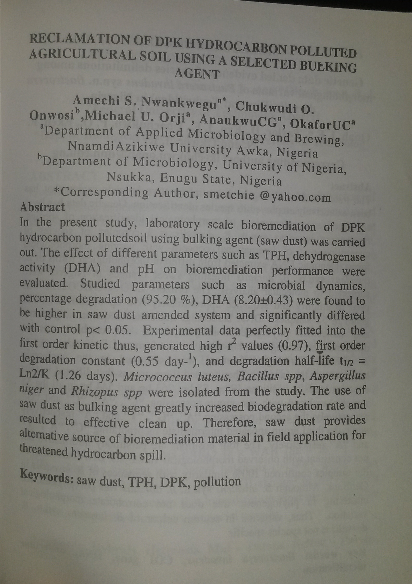 Reclamation of DPK hydrocarbon polluted agricultural soil using a selected bulikg agent