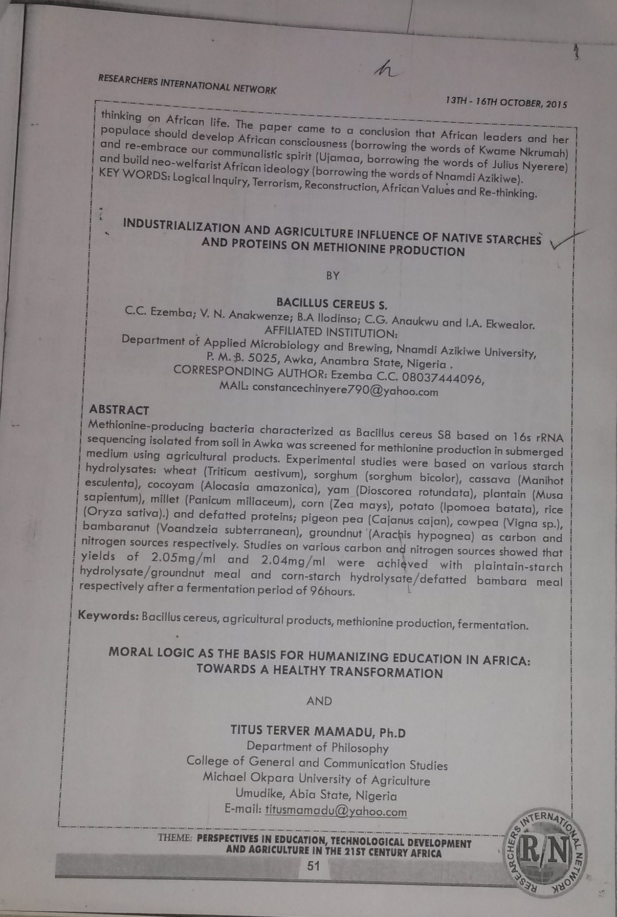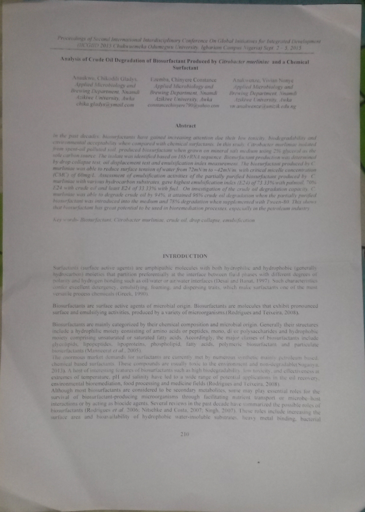 Anaukwu,CG, Ezemba,CC, Anakwenze,VN, Agu, KC, Okeke, BC, Awah, NS, Ekwealor, IA. (2015). Effect of biosurfactant produced by Citrobacter murlinae AF025369 and a synthetic surfactant on degradation of crude oil. Edorium Journal of Microbiology. Forthcoming