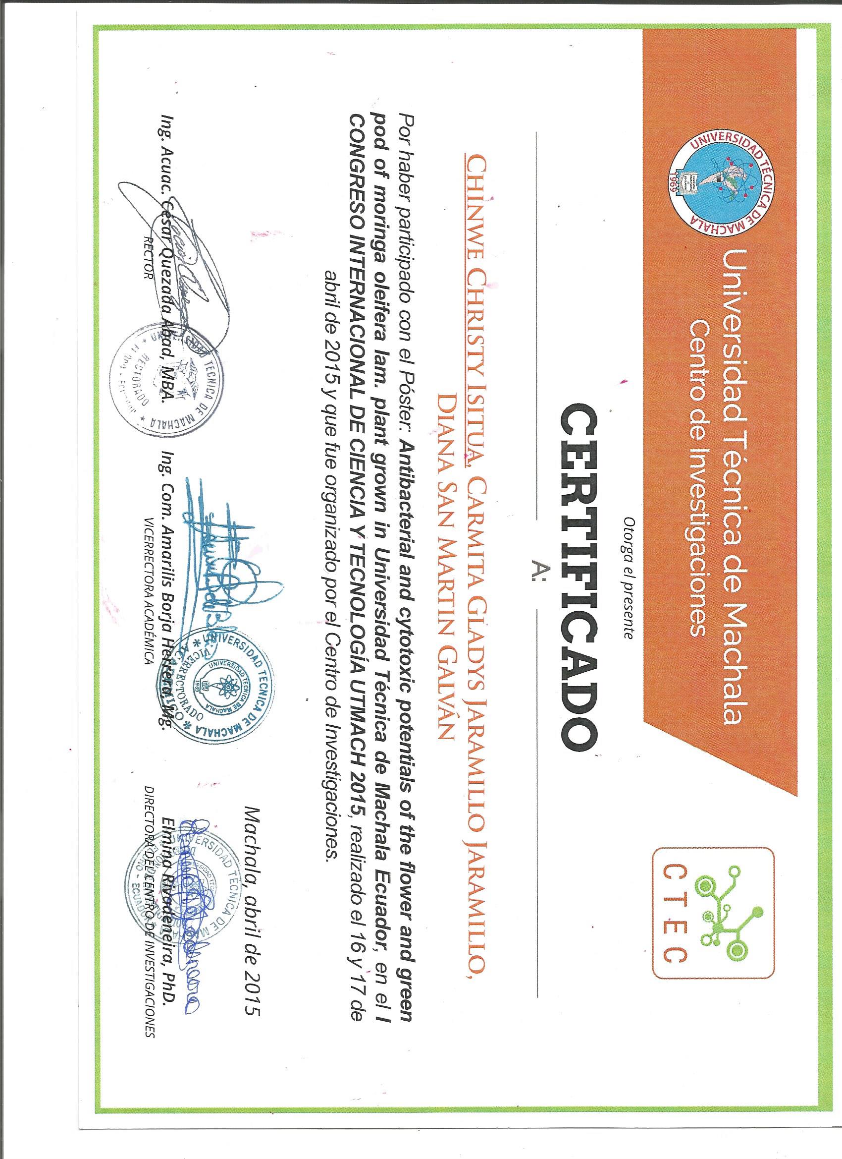 I Congreso Internacional de Ciencia y Tecnologia (CTEC), held in Universidad Tecnica de Machala Centro de Investigaciones, El Oro, Ecuador. April 16th -17th 2015.