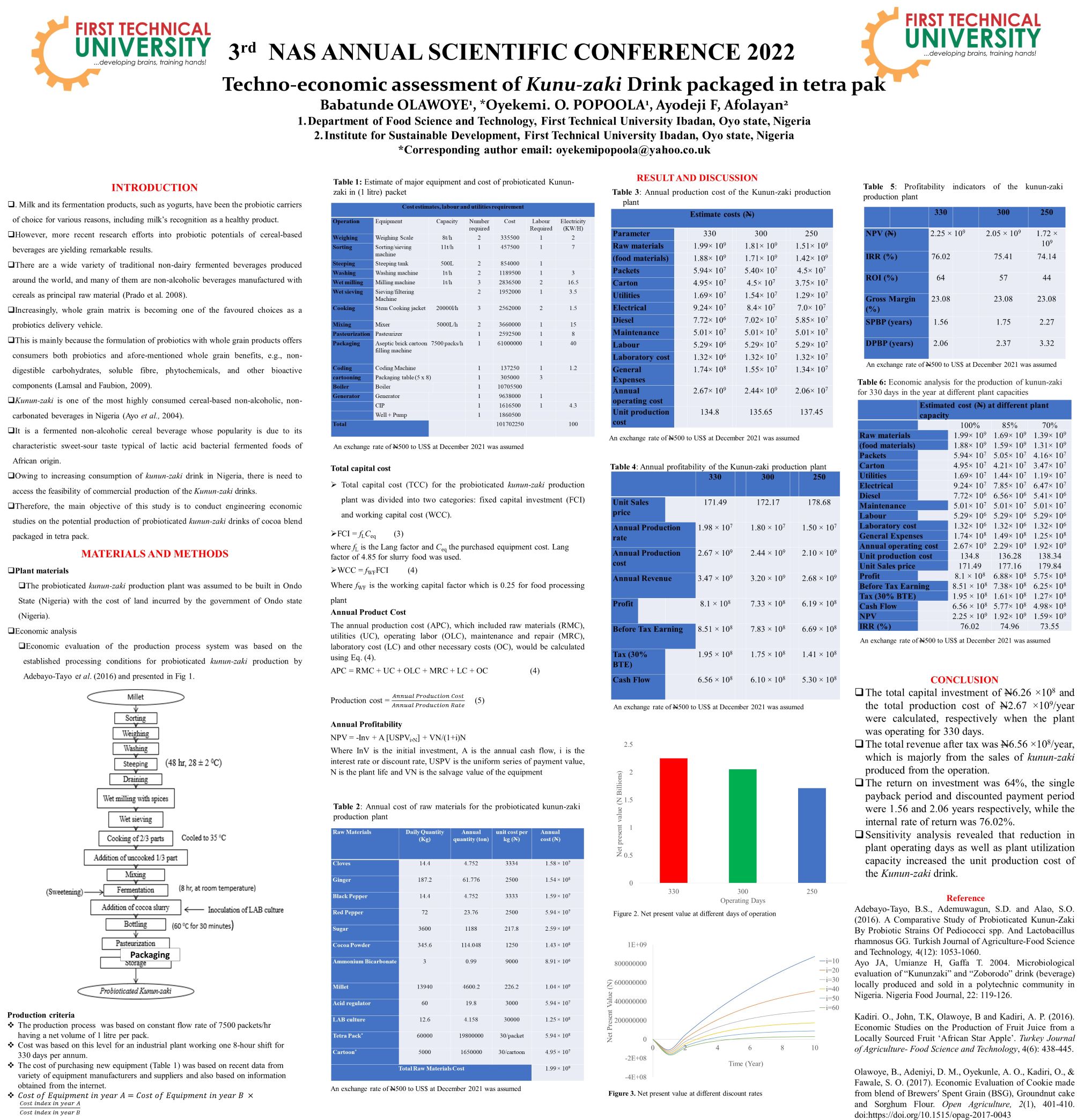 Olawoye, B., Popoola. O.O. and Afolayan, A. F. Techno Economic assessment of Kunu-zaki drink packaged in tetra pack. 3rd NAS Annual Scientific Conference. Science and Technology innovations for National Growth and Development.