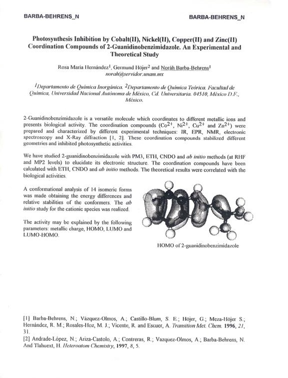 Barba-Behrens, N.Y.; Téllez, F.; Contreras, R.; Hernández, R.M.; Bernès, S.; Nöth. H. New developments on the coordination behaviour of 2-substitued bensimidazoles. Journal of Inorganic Biochemistry. 2003, 96(1), 98.