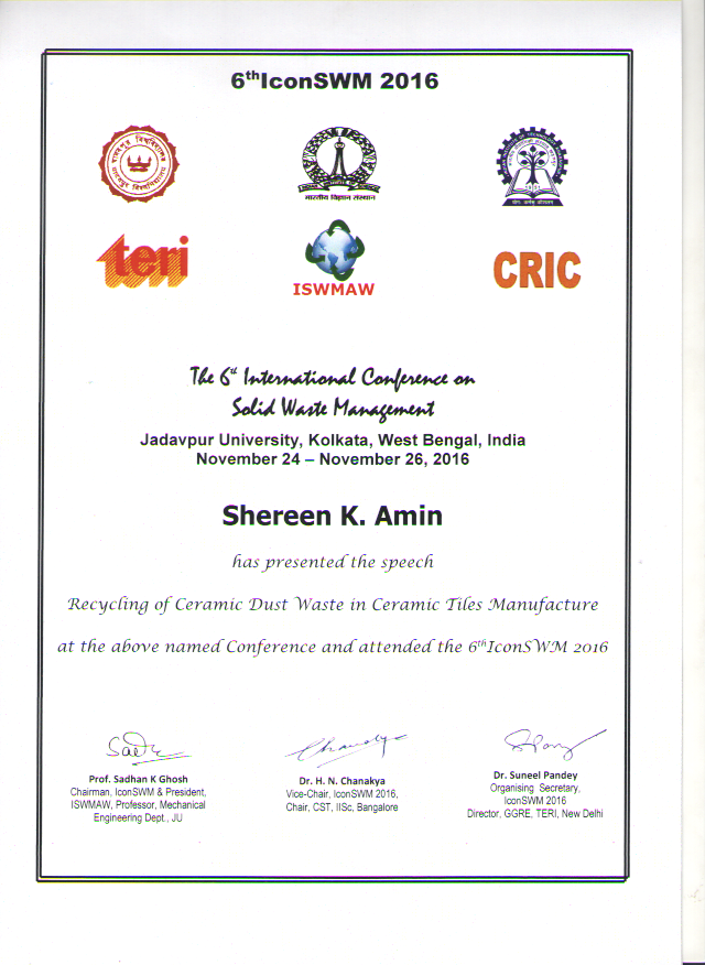 4) Elmahgary M.G., Amin Sh.K., Sadek El Sh. M., Abadir M.F., “Waste minimisation of ceramic wall tiles”, Chemical Engineering Transactions (CEt), Vol. 70, pp 421–426, 2018.