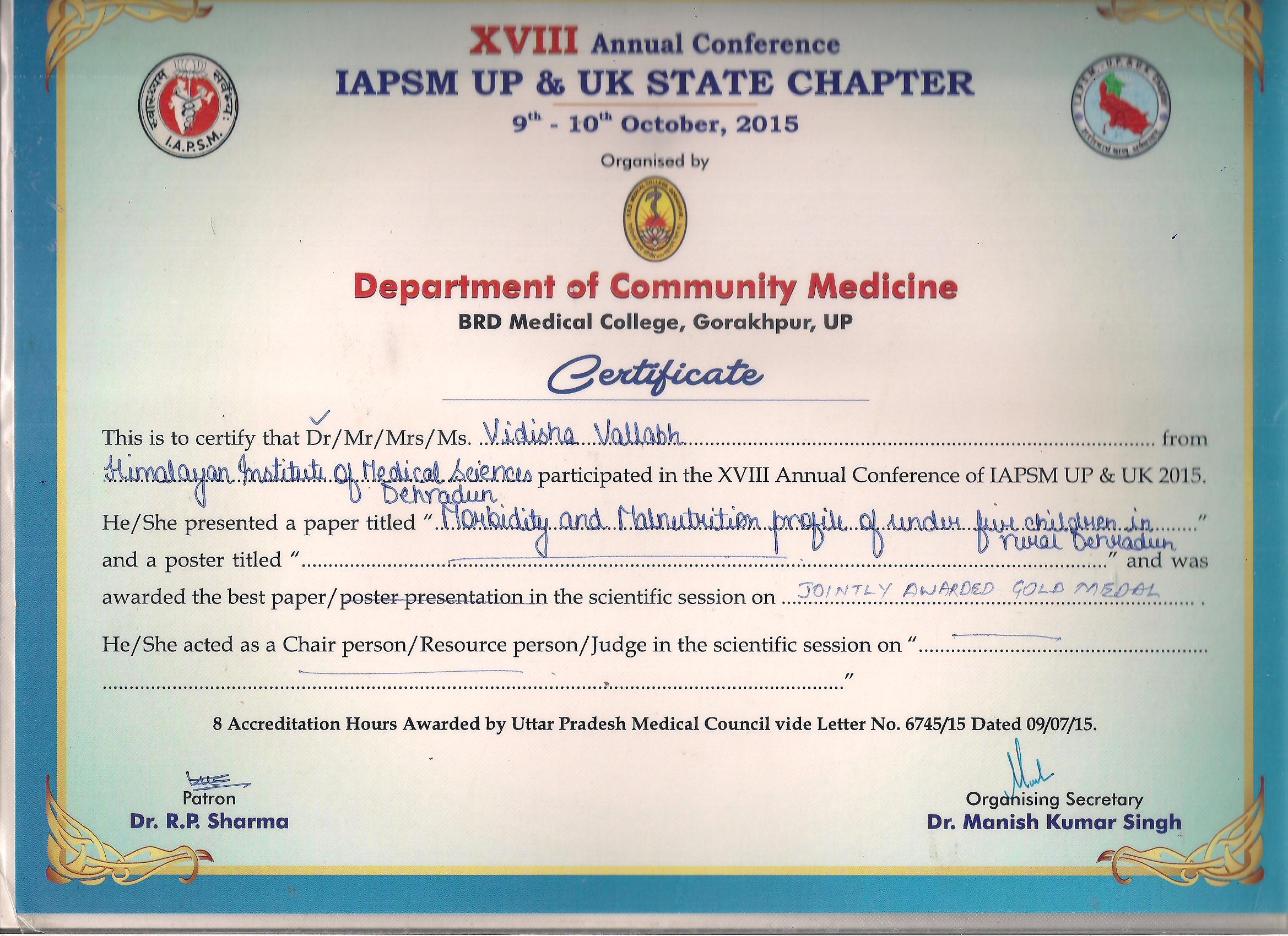 Oral paper presented on “ Morbidity and Malnutrition Profile of Under –Five Children in Rural Dehradun” at XVIII Annual conference of IAPSM UP-UK Chapter 9th -10st Oct., 2015 at BRD Medical College, Gorakhpur, UP , won gold medal for best oral paper presentation.
